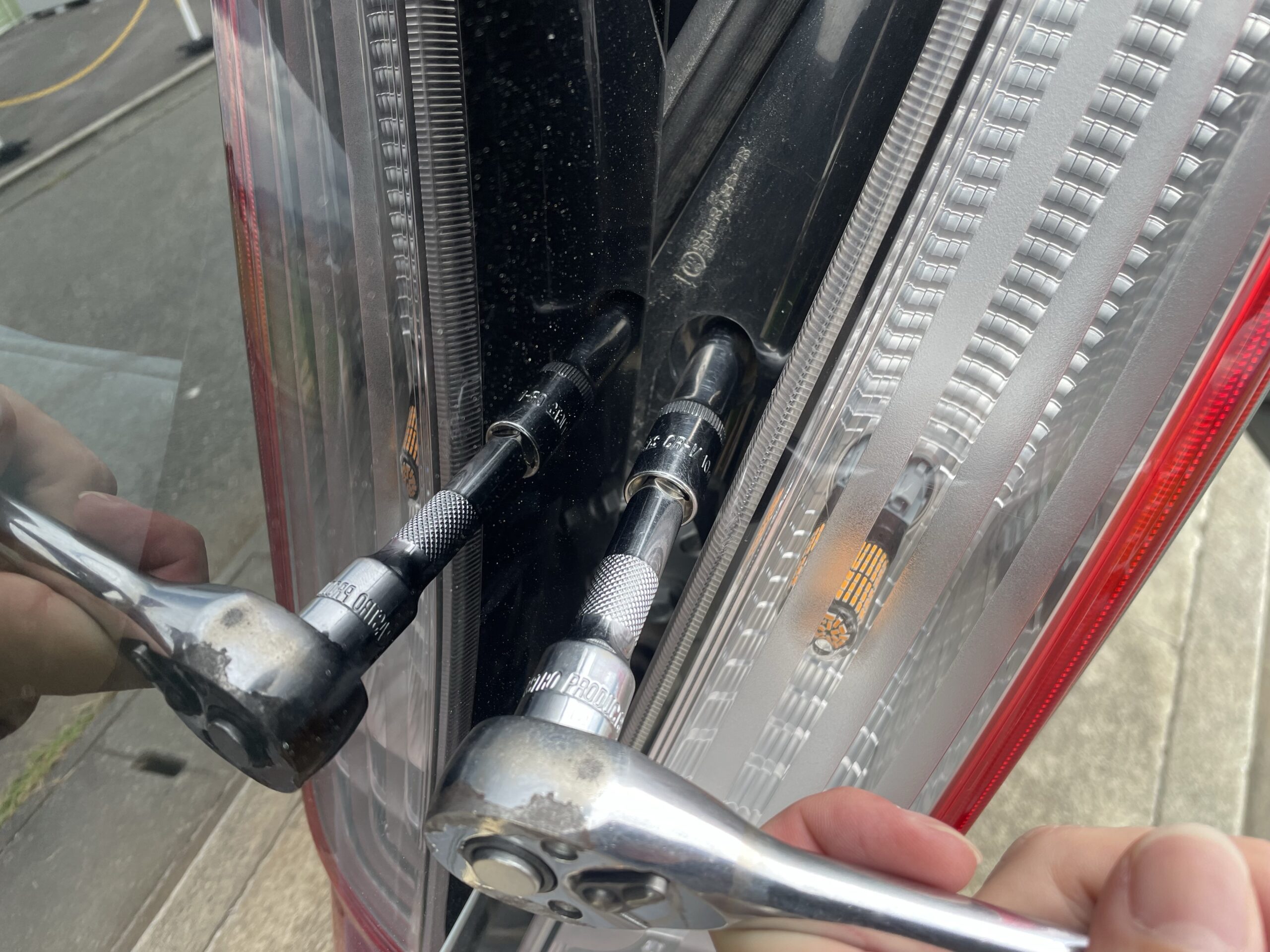 右側のテールランプを固定するボルトにアクセスするためには、エクステンションバーを使用する必要があります。トランクが横開きのせいで工具のアクセスが少々不便ですね。