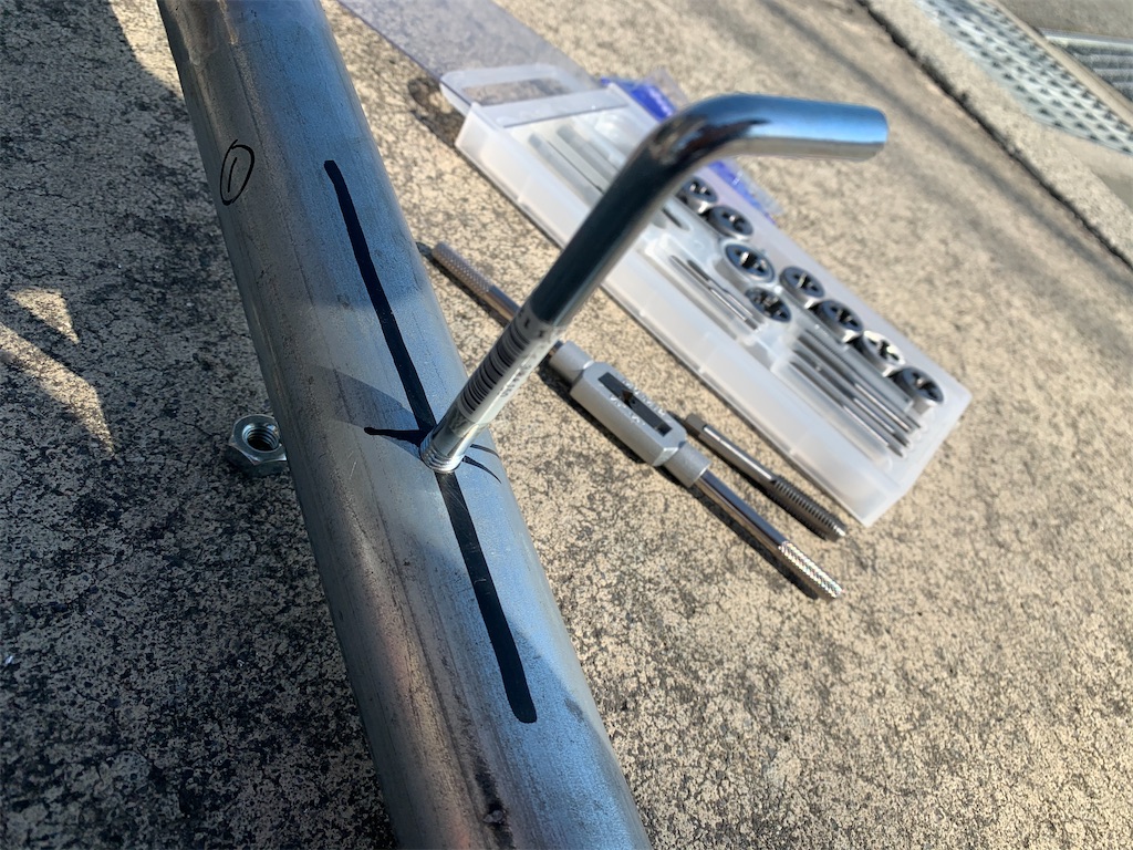 まずは、単管パイプ側に穴を空けて、タップをたてます。