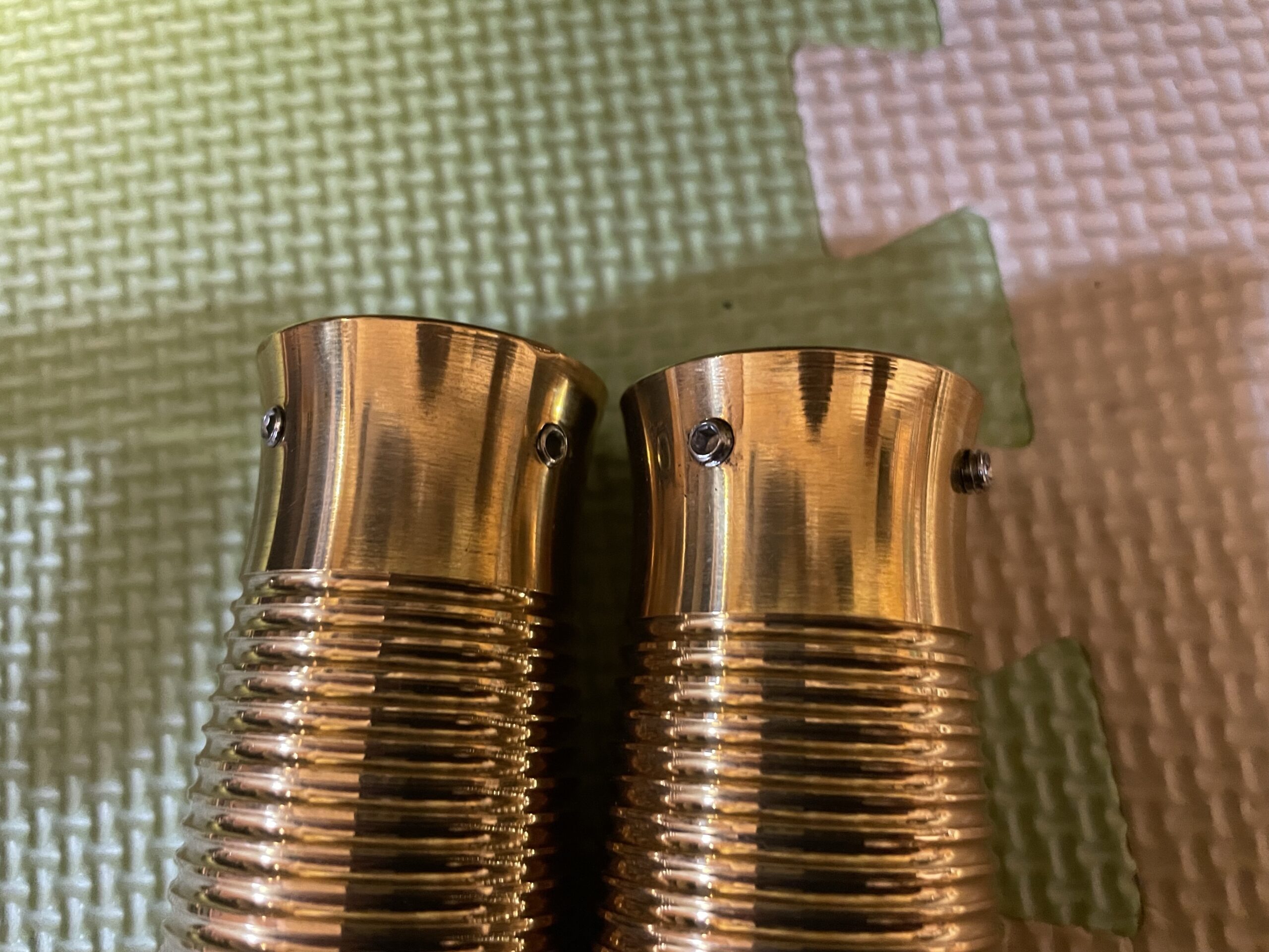 取り付け方法は、両側ともにイモネジでハンドルとスロットルに固定する方法になっていますので、今付いているグリップを外したら、そちらにこの真鍮グリップをはめ込み、2本のネジを六角レンチで締め込んでハンドルに固定してやるだけです。