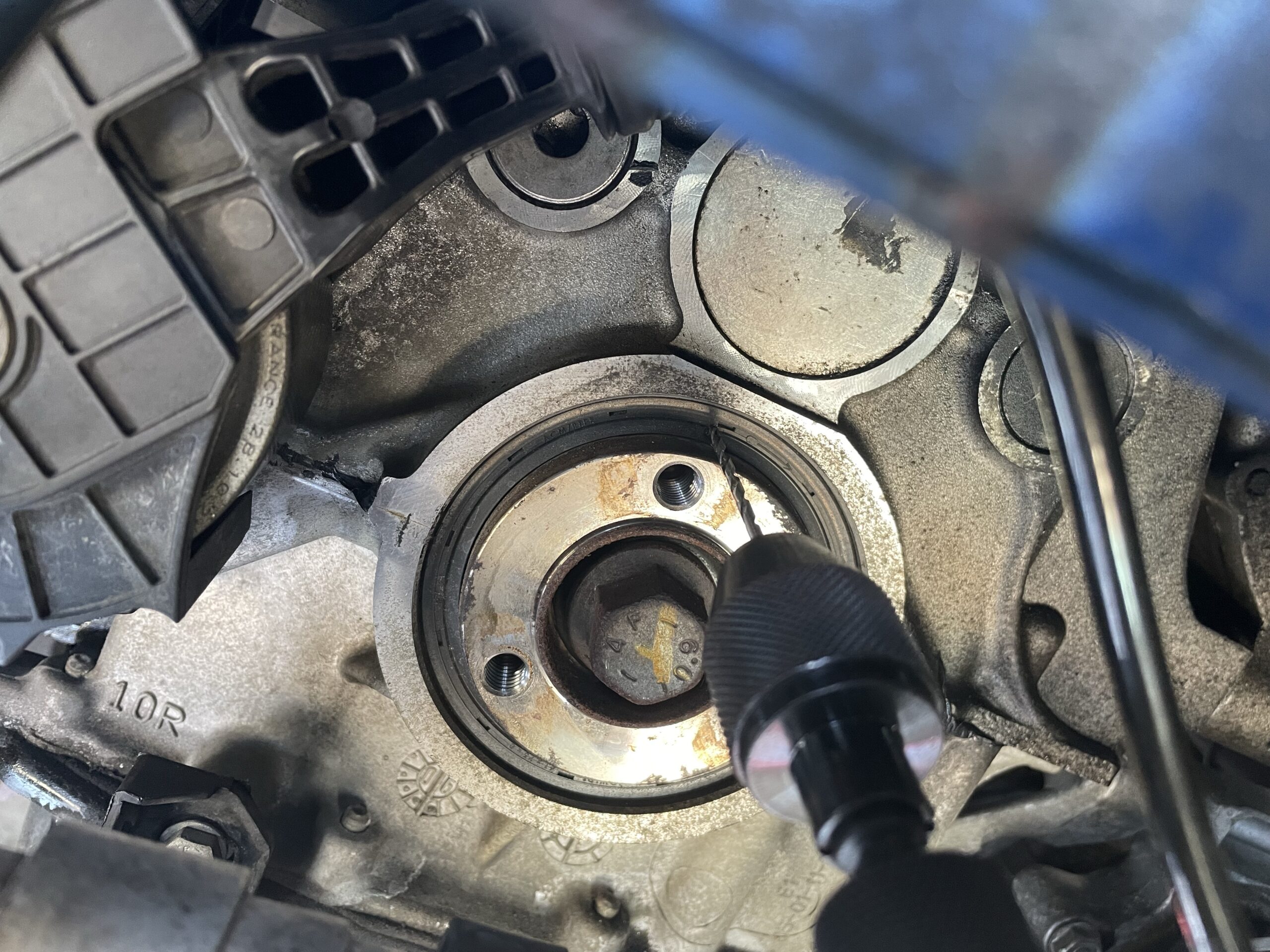 先日、R56ミニクーパーの水回り修理に伴い、ベルトやらクランクプーリーやらの脱着作業を行いましたので、そのついでにフロント側のクランクシャフトシールの交換作業もセットで行いました。