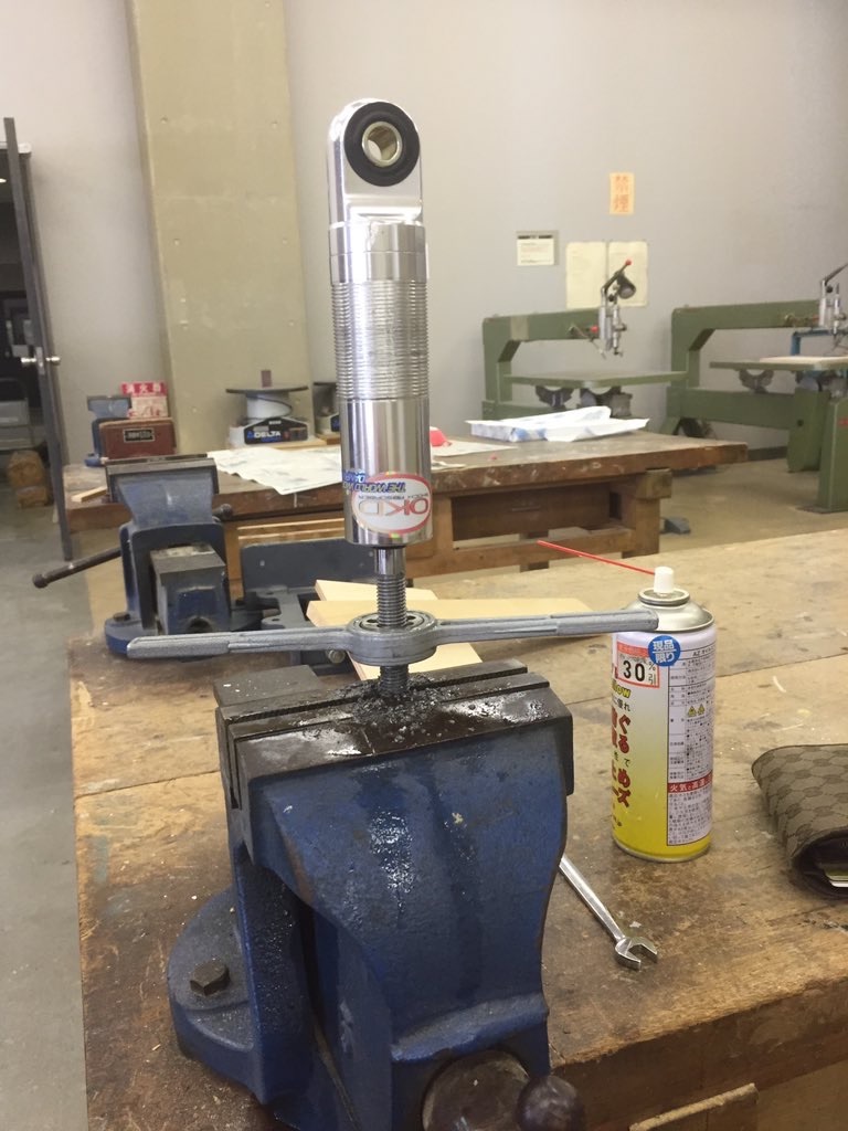 組み立てる際はスプリングにスプリングコンプレッサーを掛けてショックに組み込めるまでバネを縮めてナットとブラケットを組み込めば完了です。