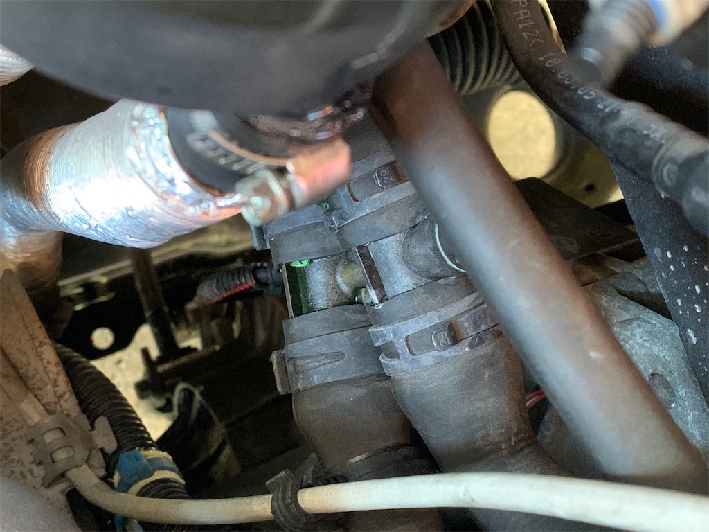 1つはサーモスタットハウジングの少し奥側。パワステタンクの右側という方が分かりやすいかも?もう一つはエンジンルーム左寄りのラジエターホースに付いています。