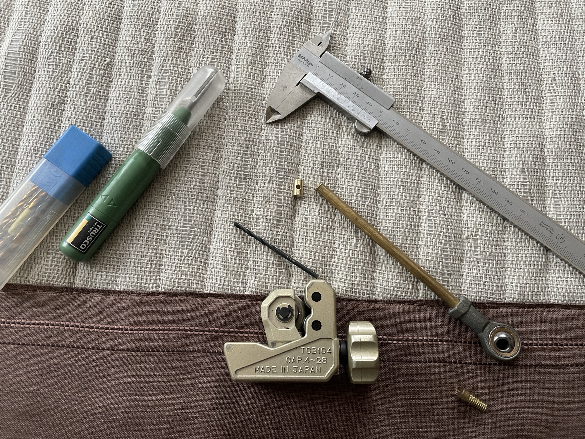 まずは、真鍮の丸棒を必要な長さにカット。グラインダーか高速カッターで切る予定でしたが、雨が降っていて室内で使える工具を探したところ、パイプカッターに行きつきました。パイプじゃないけど、真鍮ぐらいなら切れますね。