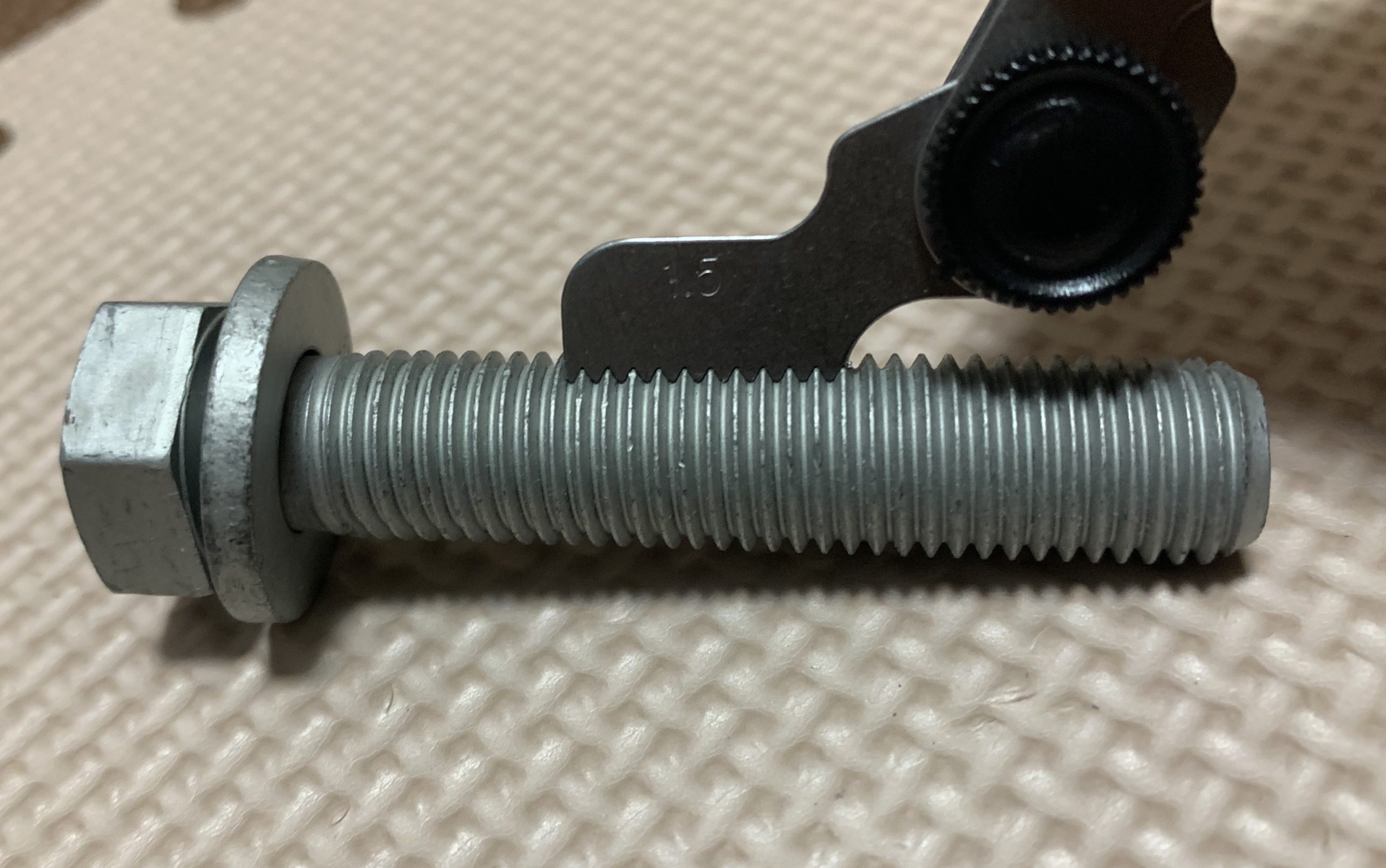 ネジのピッチとは、ボルトを1回転させた時に、何ミリ締まるか?という数値です。先ほど計測したネジピッチは2.0。これは1周で2ミリ締まるという意味です。