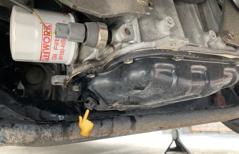 アンダーカバーを外したら、早速オイルパンのドレンボルト(14ミリ)を外してエンジンオイルを抜きます。