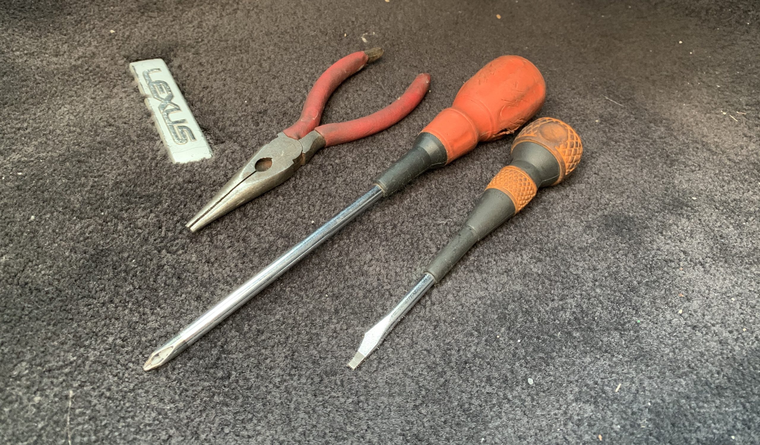 ラジオペンチは、リレーを車体から外す時に使い、細いマイナスドライバーはリレーから固定用クリップを移植する際に使います。
