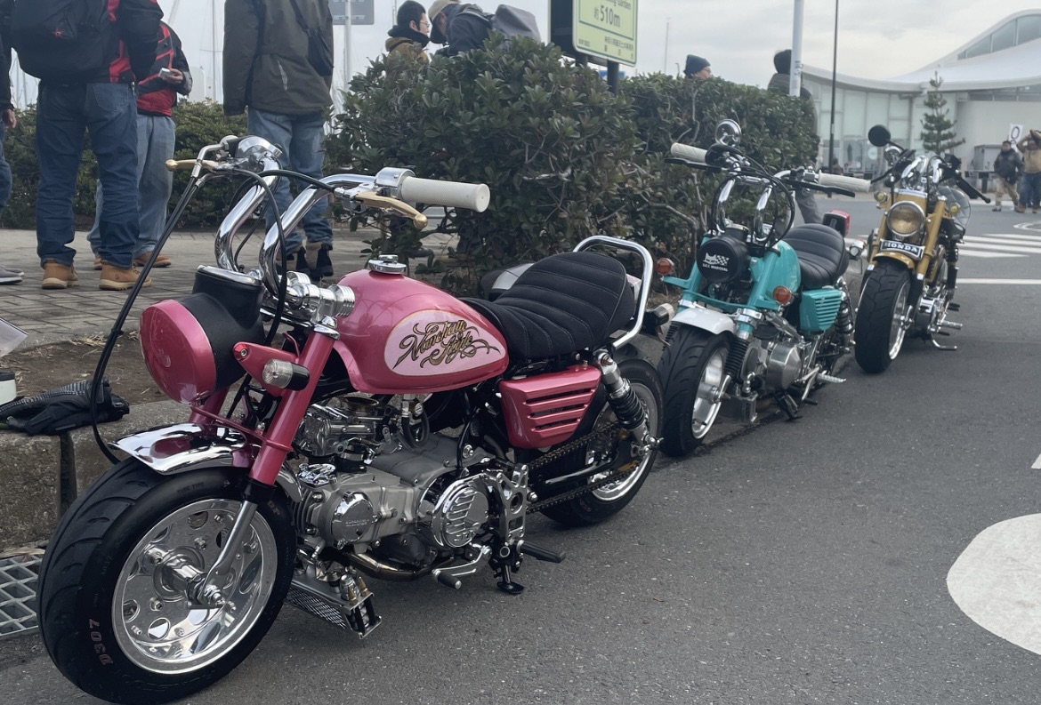 手前のピンクのモンキーは5Lタンクが取り付けされていますが、ヘッドライトが5L純正よりも一回り小さめのライトが付けられてます。個人的にはこの組み合わせがかなり好き。