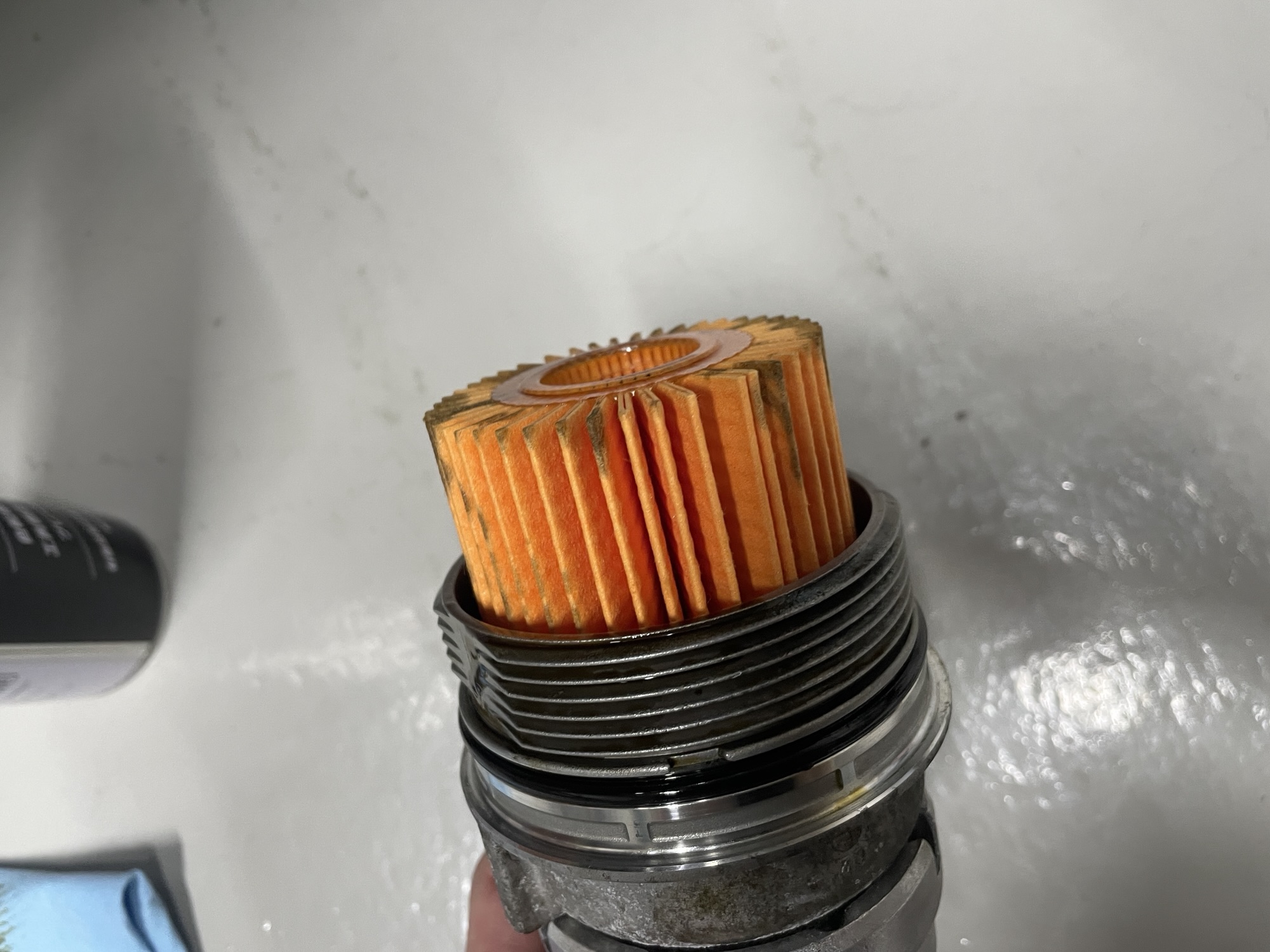 フィルターを少し緩めて、中のオイルが出てくるのを待ったら、フィルターを完全に外して新しいフィルターを差し込み、Oリングを新品に交換した後、Oリングにエンジンオイルを塗布して、元通り締め付けてやればOKです。