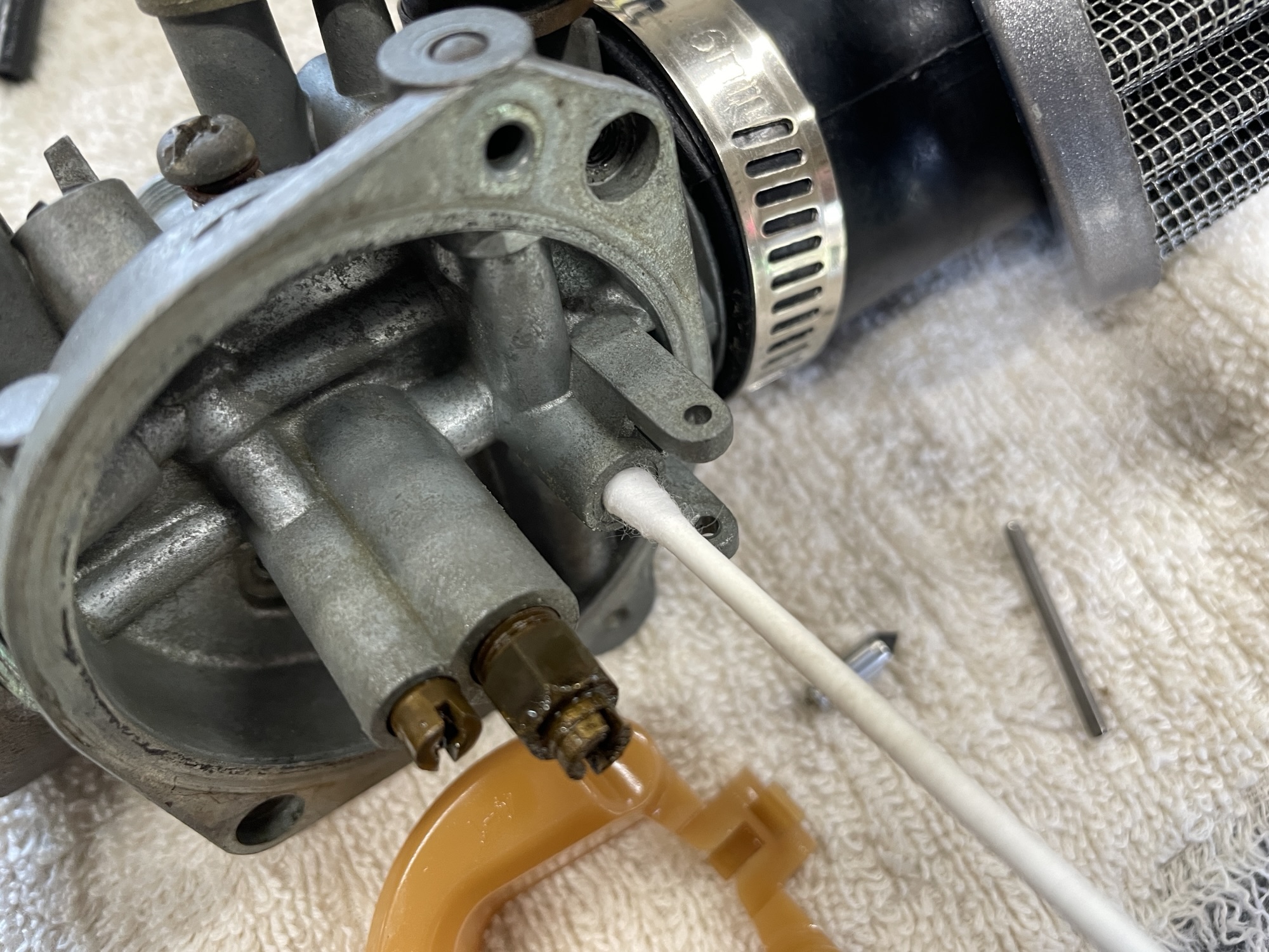 フロートバルブを交換する際には、フロートバルブがハマっているガソリンの流入経路に綿棒を入れて、バルブの当たり面を清掃しておくことをお勧めします。フロートバルブを交換する前に一度掃除をしてみて様子見してみても良いぐらいです。