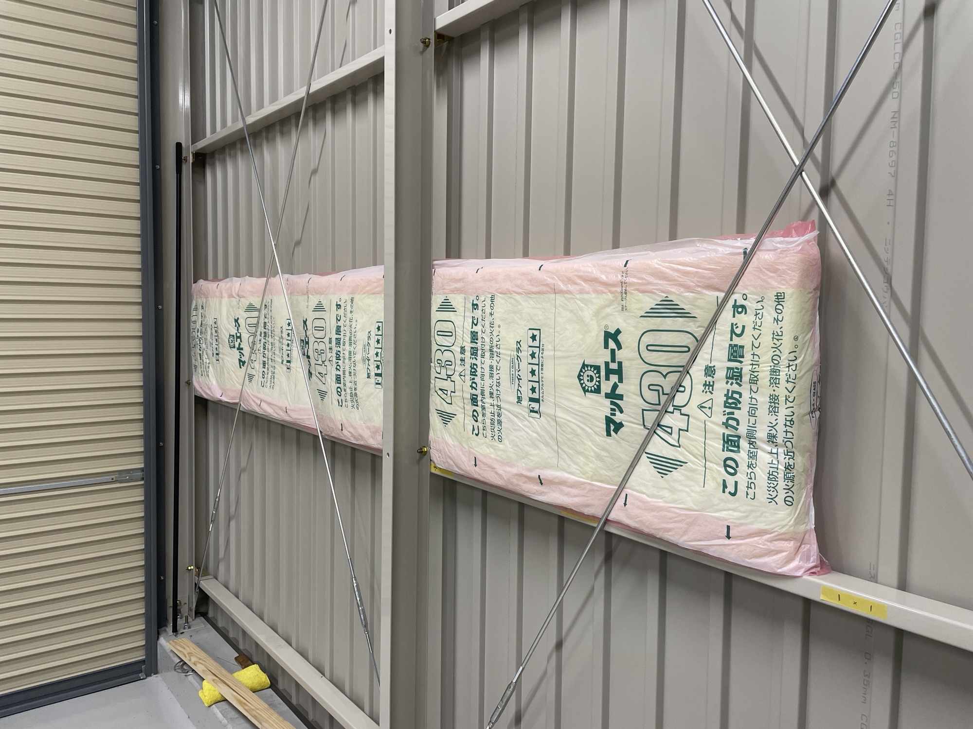 イナバとかのガレージだとこの断熱材の入れ方は無理なので、木材下地を組んで下地と下地の間に断熱材を入れてタッカーでの固定になるかと思います。