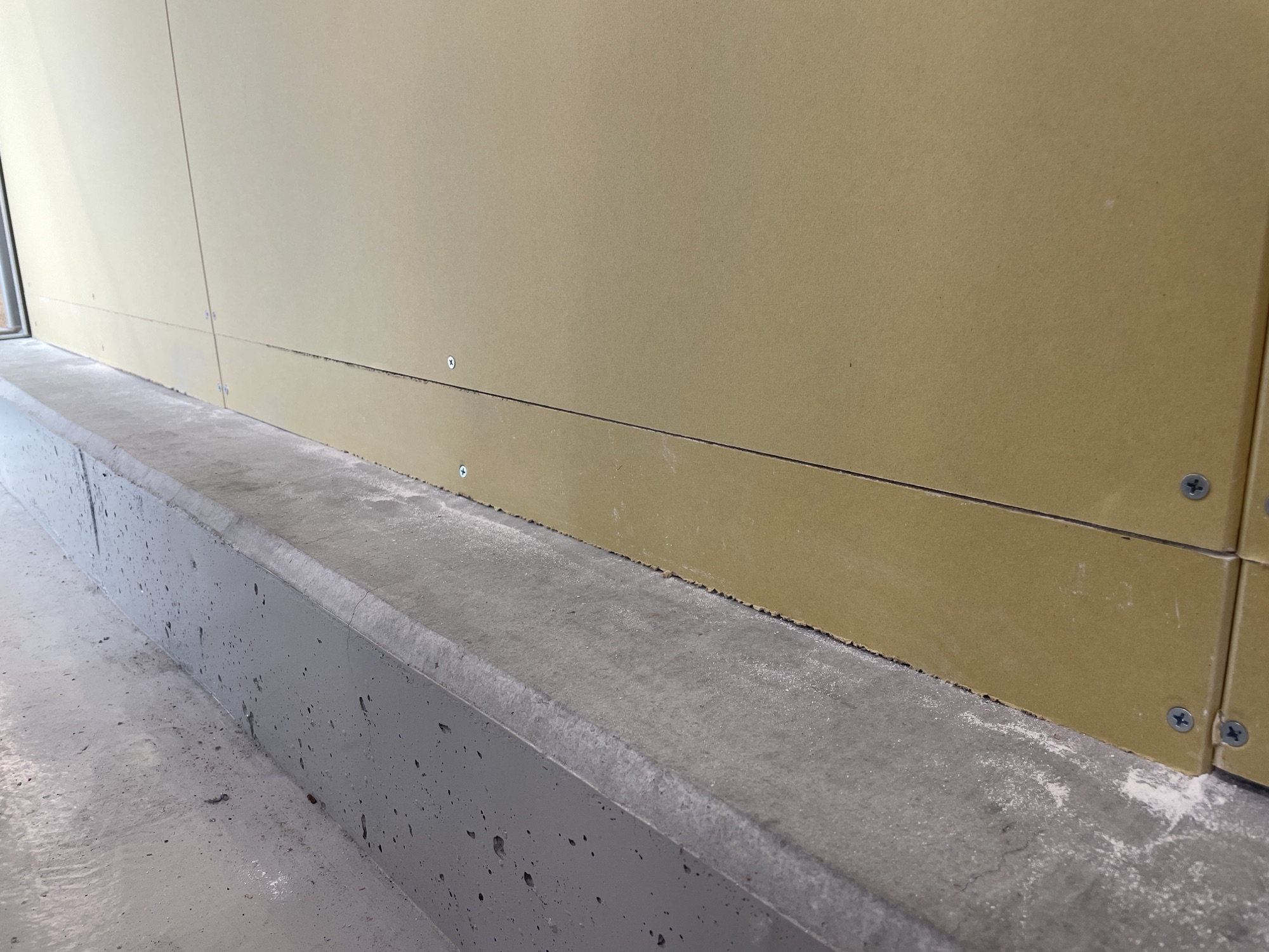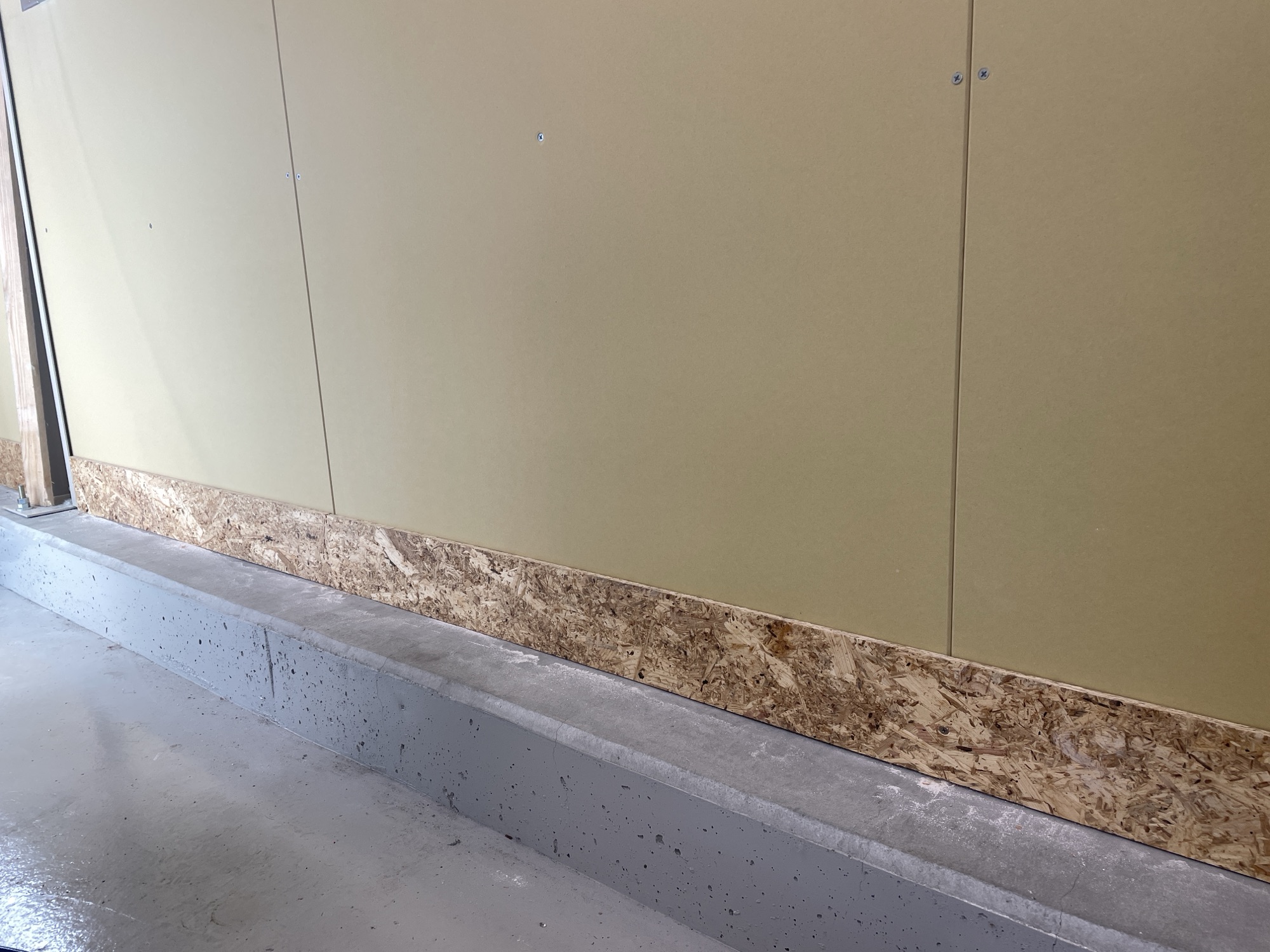 石膏ボードの下側が空いているのは、柱を固定しているアンカーボルトが邪魔で、それ以上下げられないため。そのため、1箇所に合わせたラインで石膏ボードを貼って、OSB合板を巾木代わりに貼り付けて隠します。