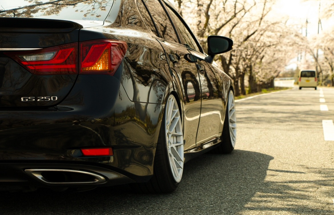たまたま好きなホイールが安く手に入ったので、たまたま購入したGSに履かせてみましたが、車高調を組み込んで車高だけ下げた車のホイールだけ交換してこのぐらいの仕上がりなら文句無しですね。